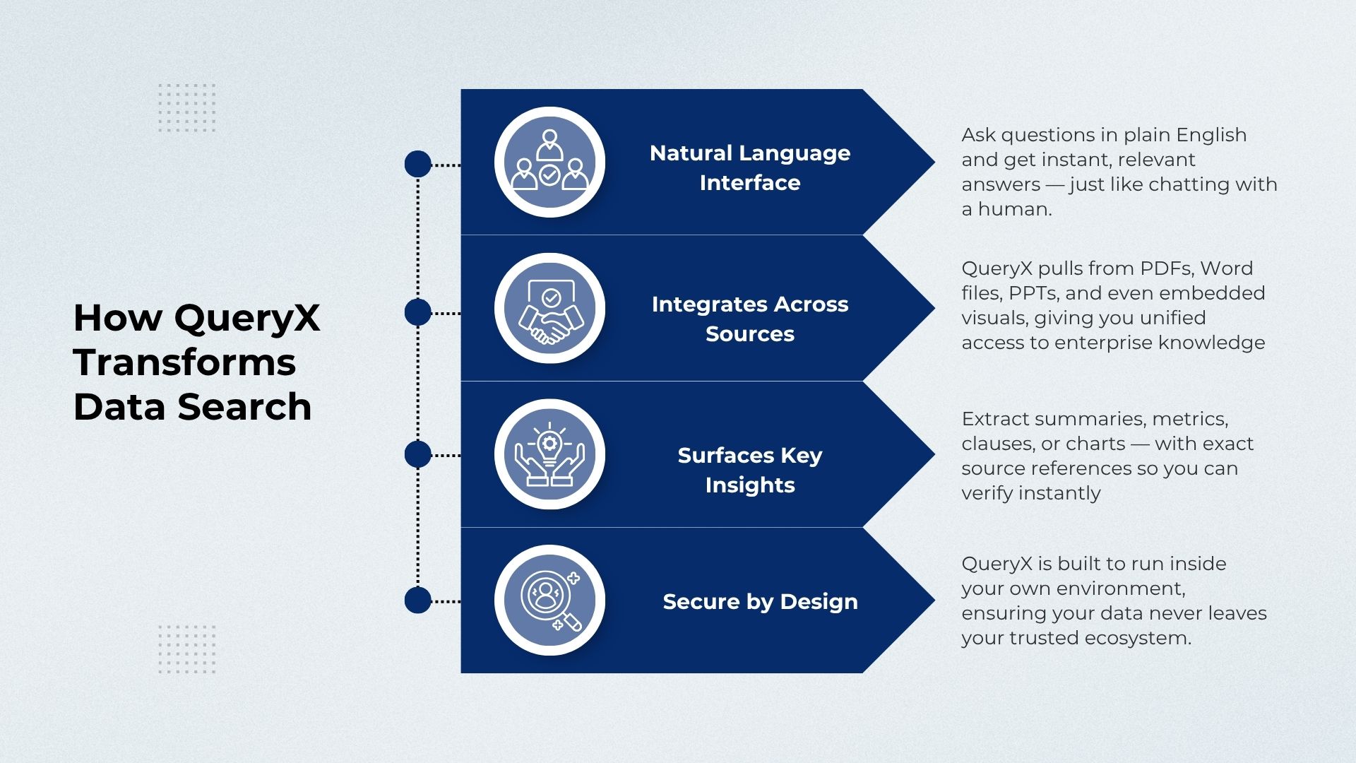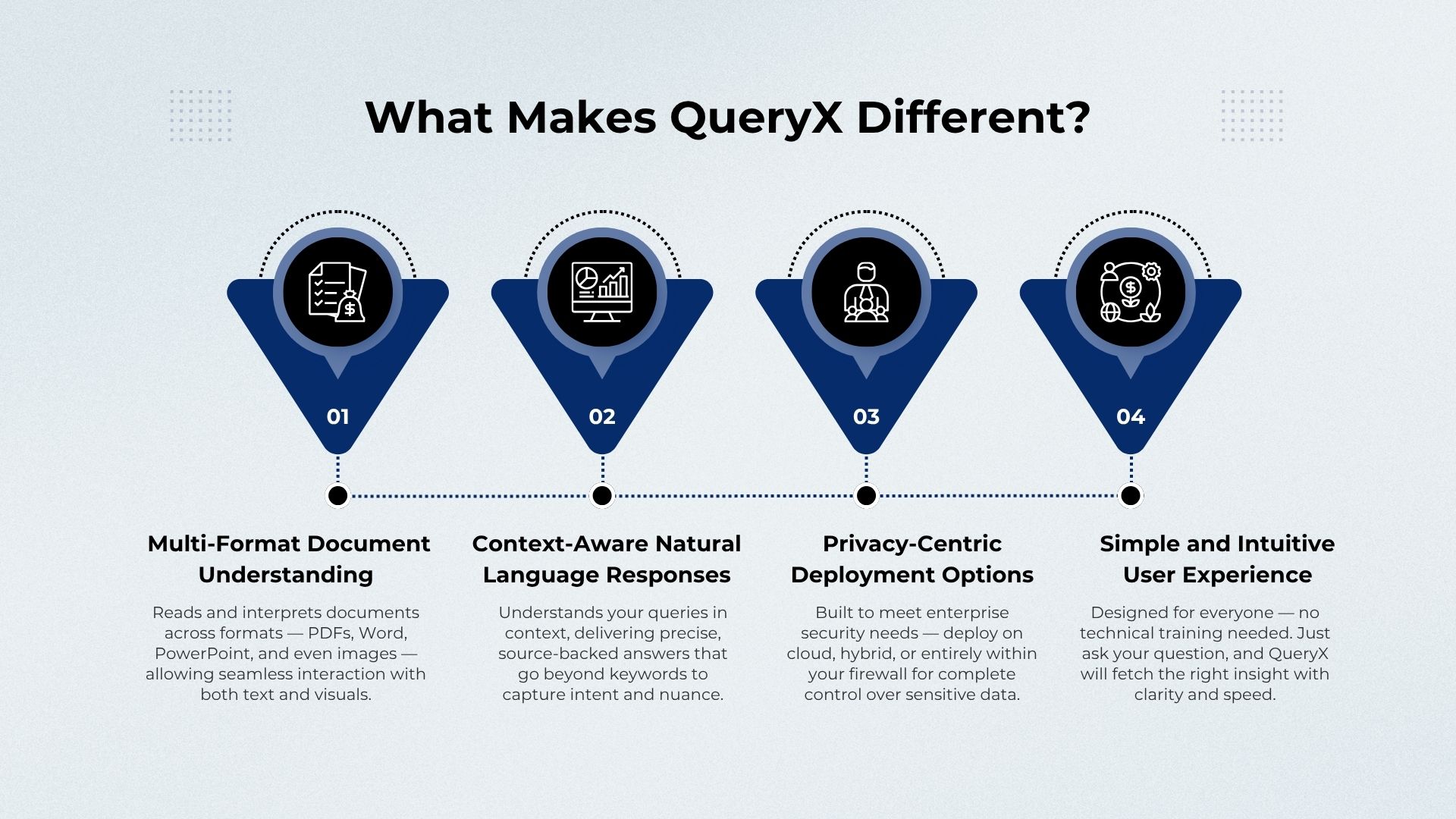 QueryX doesn't just read text; it understands your documents. This includes the ability to interpret and extract insights from various formats – PDFs, Word documents, PowerPoint presentations, and even embedded images, charts, and tables. This multi-modal capability ensures a holistic grasp of your data, allowing you to query visual information just as easily as textual content.