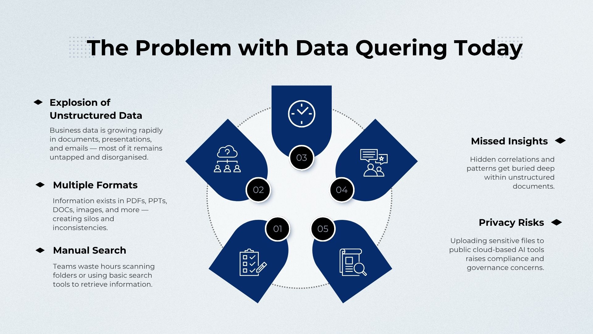 Information Overload: The sheer volume of documents makes it nearly impossible to pinpoint exact answers swiftly.